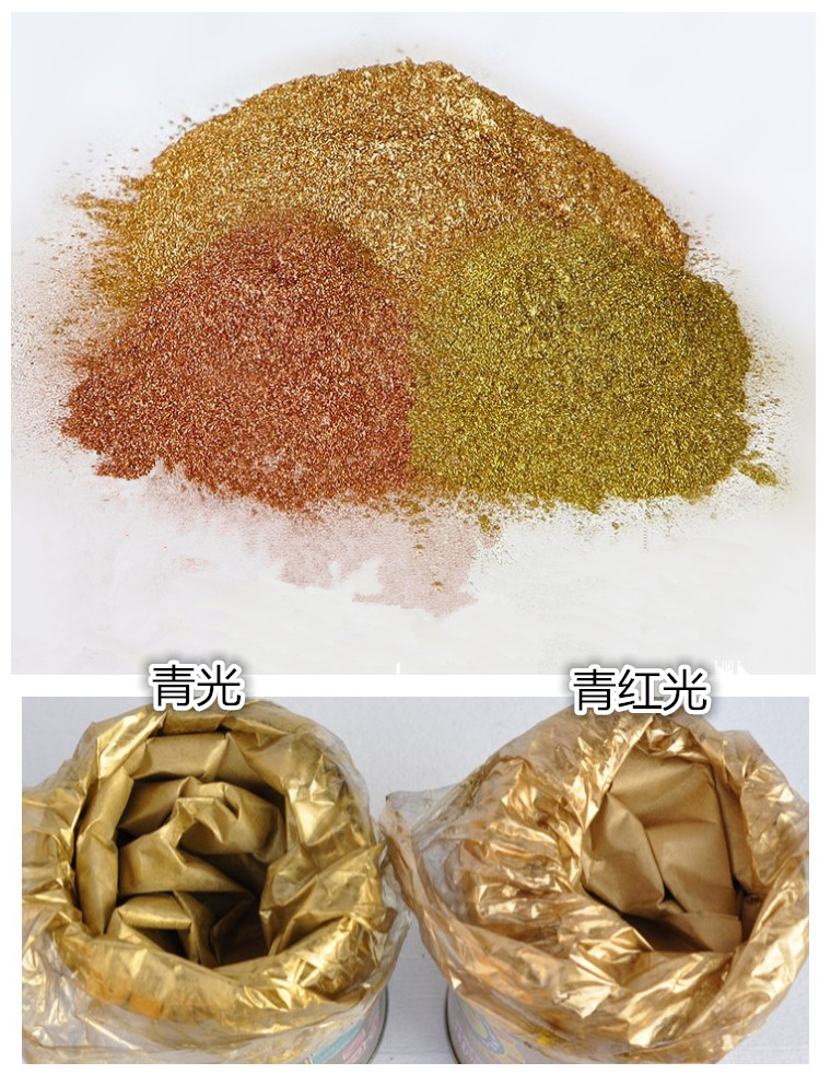 銅金粉是一種以銅、鋅為主要原料,經(jīng)過熔煉、球磨、拋光等工序加工的極細微的鱗片狀金屬粉末,又稱銅鋅金粉,俗稱金粉。 我司銅金粉色相有:紅金、青金、青紅金、古銅金等。 銅金粉表面有脂肪酸保護層,高溫、水、汗、堿性介質(zhì)都很容易破壞其表面的保護層,進而使之緩慢氧化,逐漸失去原有金屬光澤。 銅金粉使用過程中應盡量避免使用硝基纖維素和環(huán)氧樹脂,因二者均會與銅發(fā)生化學反應而生成膠狀物,也應盡可能選用低酸值(小于3)的樹脂,樹脂經(jīng)系列的酸值越低越好。溶劑優(yōu)先選用芳烴類和酯類,避免選用醇類、酮類以及酸化不完全的脂類。